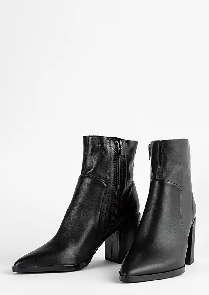 Brazen is the ultimate black leather ankle boot, defined by its sleek pointed toe and sculpted block heel. A refined staple designed to elevate your every look.