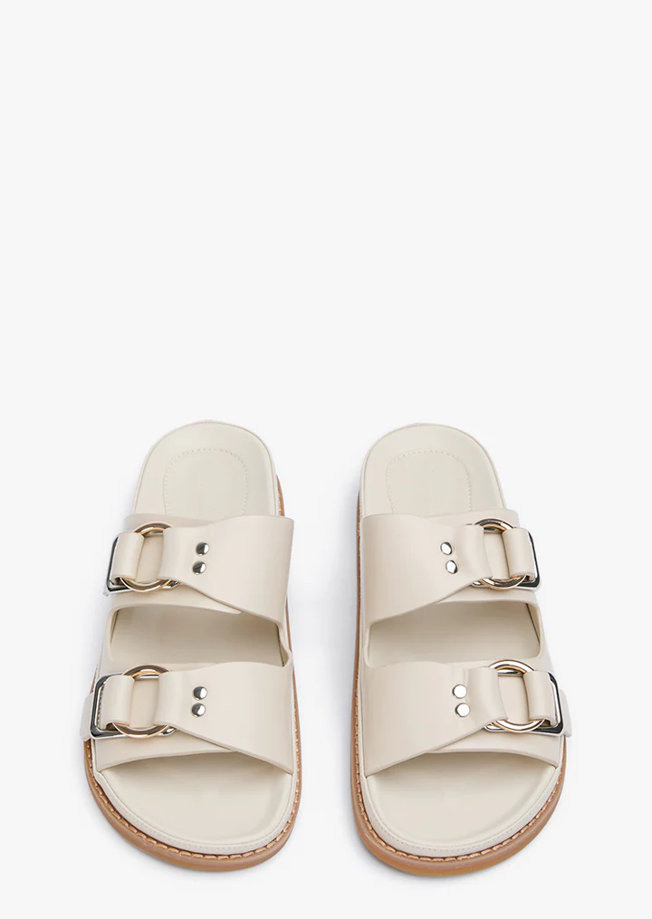 Introducing your new ride or die, Hunter. The flat slides designed for summer-time adventures, around-the-house wear or for a day full of errands - whatever your reason, Hunter has you sorted. Designed with a flat cushioned foot-bed and a thick chunky sole, alongside a round open toe and a flattering two-strap leather upper and all new leather lining. Finished with silver-toned hardware and a gold toned circular ring.