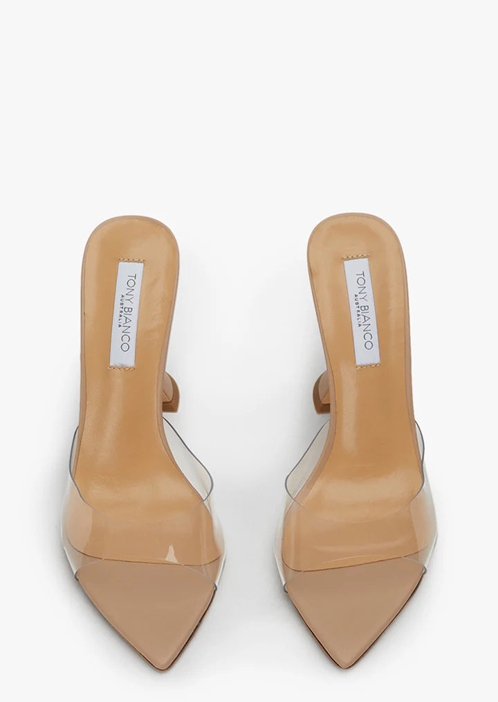 Pointed perfection are the Marcel mules. Designed with a sleek silhouette, an open pointed toe, low cut rounded vamp and chic hourglass shaped heel, this clear heel is seriously on-trend.