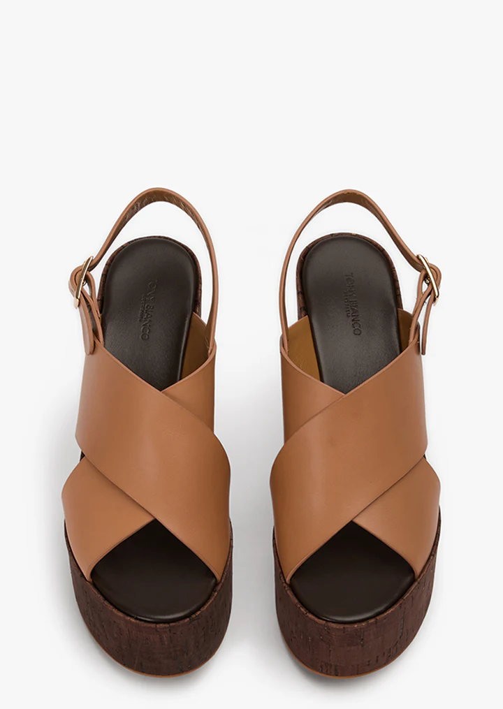 Your warm weather wardrobe isn't complete without Vogue. Simplistic in design, this wedge is on ode to the 70's featuring an adjustable ankle strap and thick crossover strap detailing.